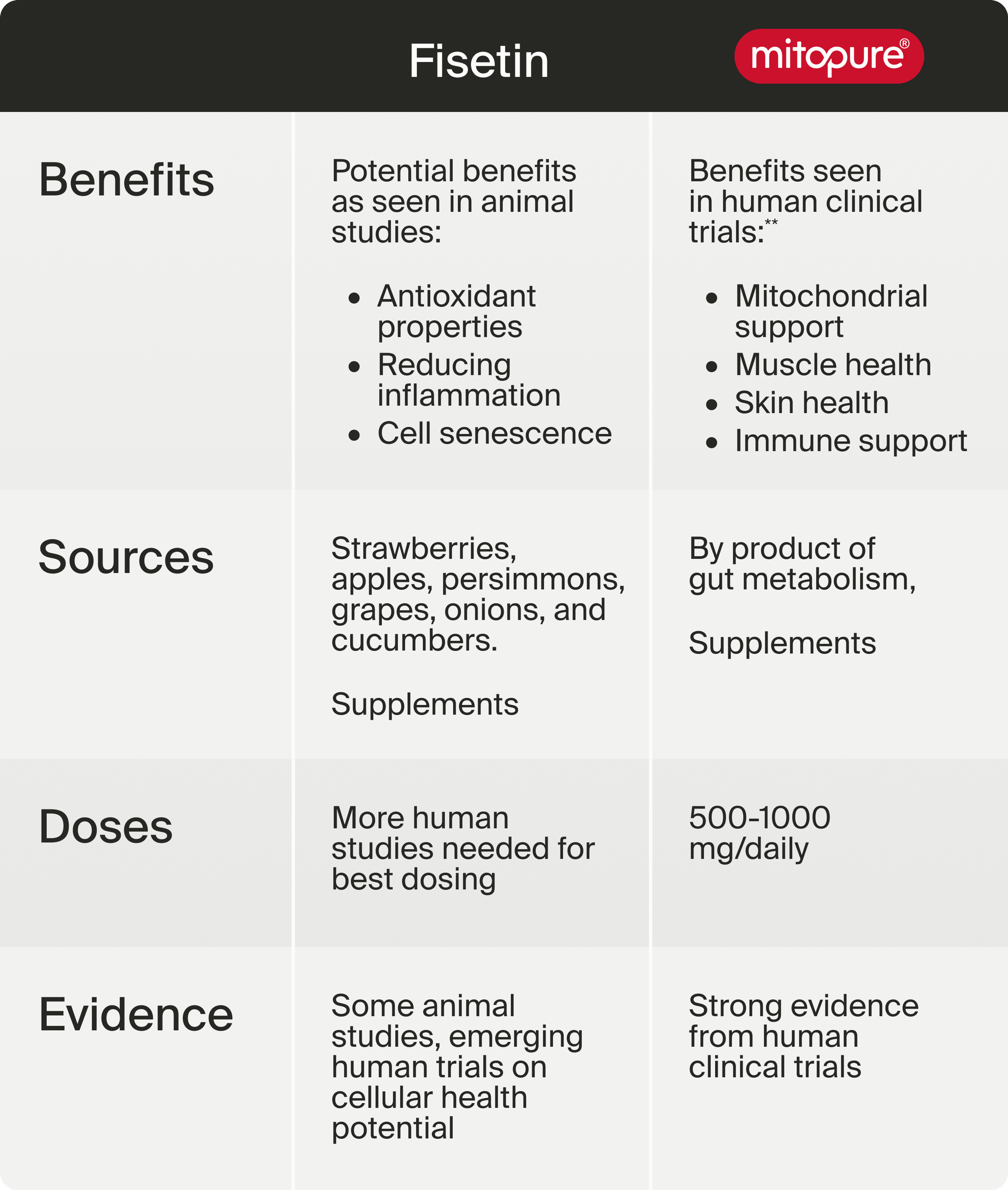 While the research for both molecules is promising, Mitopure (Urolithin A) has far more human-level data to support both its safety and efficacy. To truly understand how fisetin can support human health, more clinical trials will be needed; however, the benefits of Mitoupre for humans are robust and continue to grow.